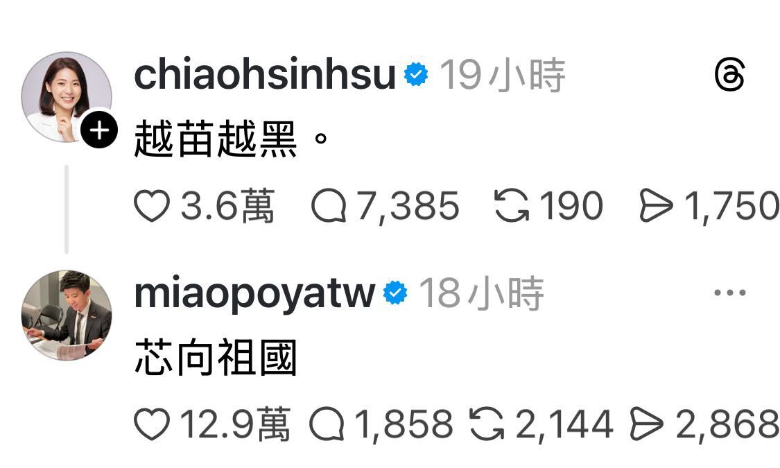 ,讓國民黨立委徐巧芯忍不住發文直呼,「越苗越黑。」沒想到苗博雅隨即就在底下留言