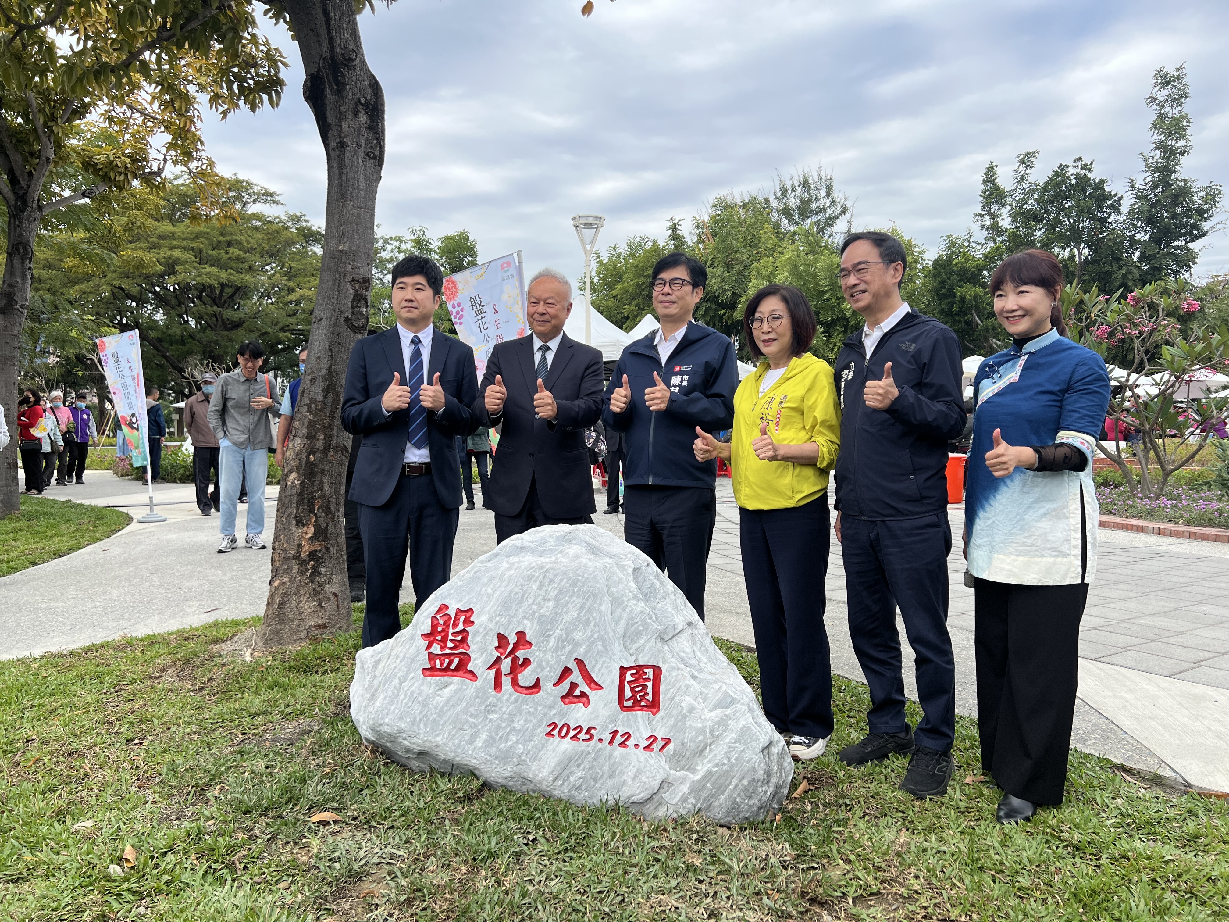 市長陳其邁說,盤花公園以象徵客家精神的「五花九香」植物為主軸,搭配居民共創的「