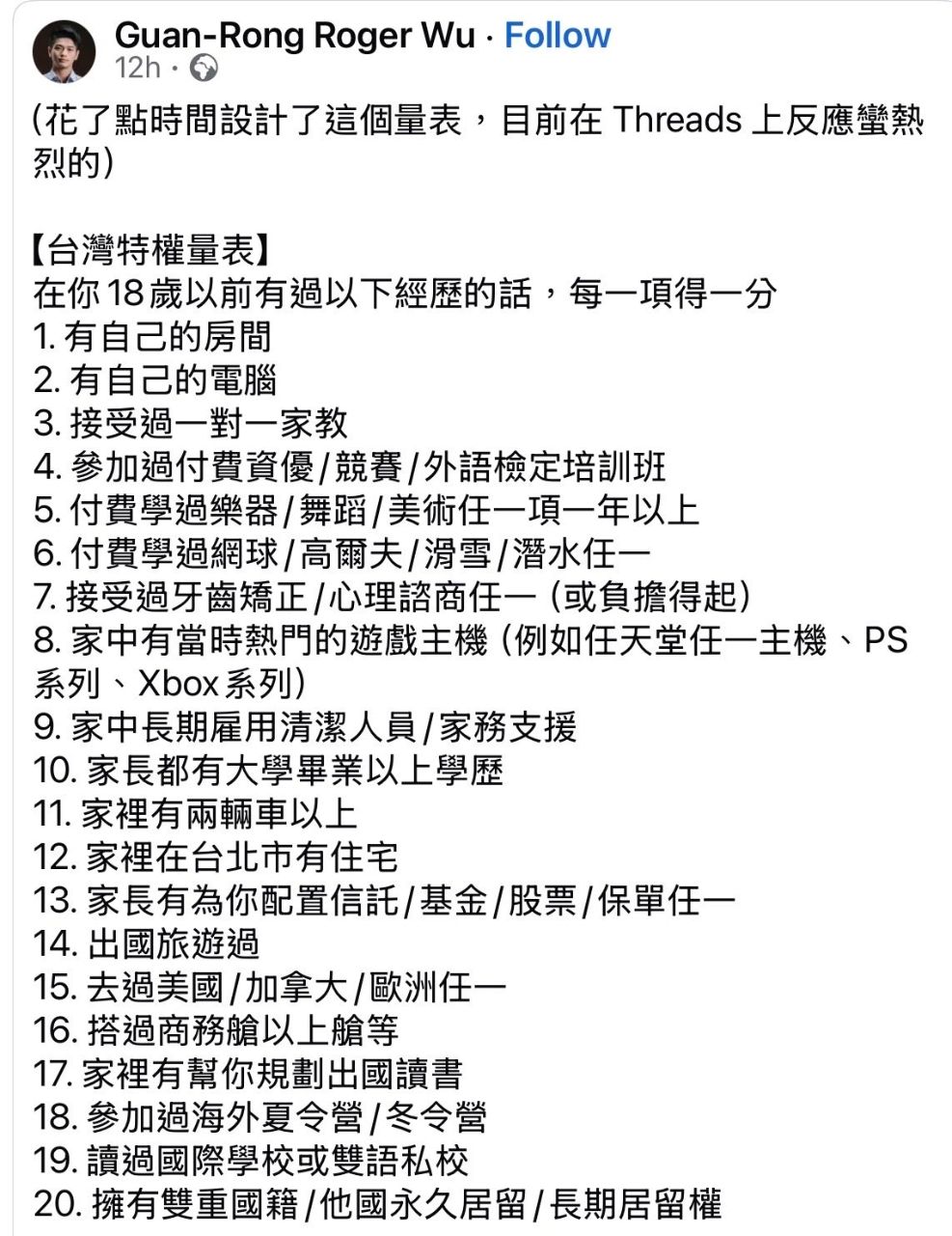 脆在批評建中生特權以後有人做了特權量表