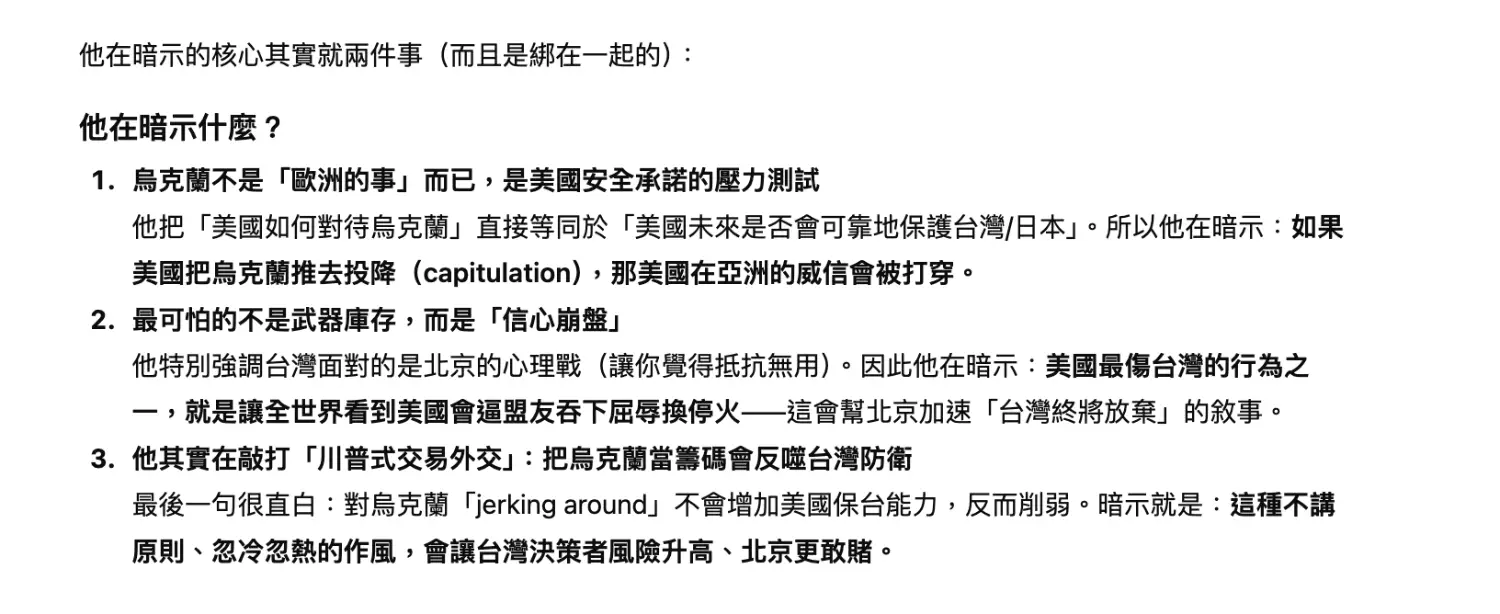 3. 他其實在敲打「川普式交易外交」:把烏克蘭當籌碼會反噬台灣防衛