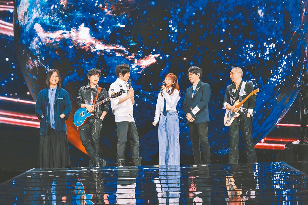 五月天1日台中演唱會,小玫瑰(右三)擔任嘉賓。(相信音樂提供)