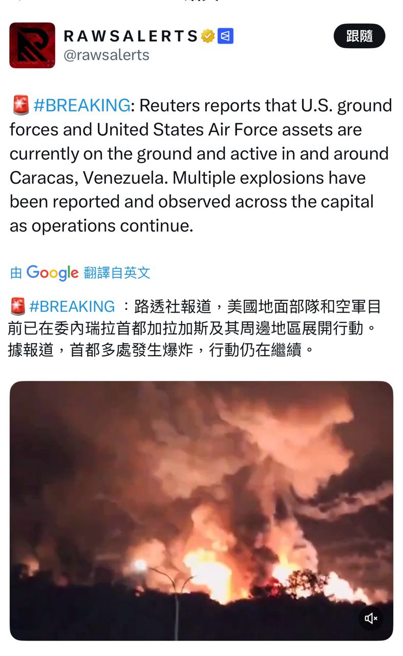 阿美莉卡大統領唐納德。特朗普稍早正式下令對委內瑞拉首都附近軍事設施展開轟炸,看