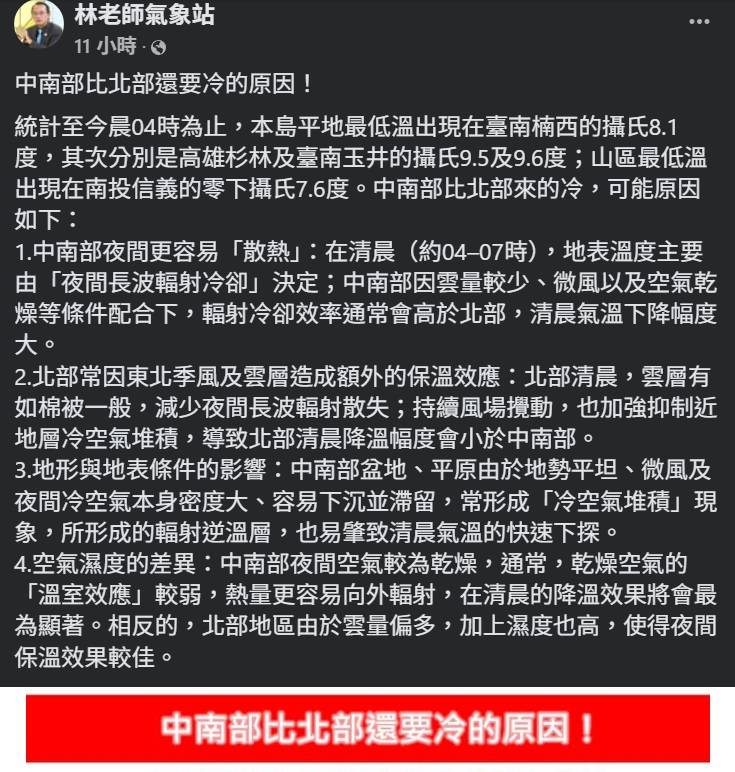 強烈大陸冷氣團以及輻射冷卻的影響。這次強烈大陸冷氣團來襲,又出現中南部比北部低