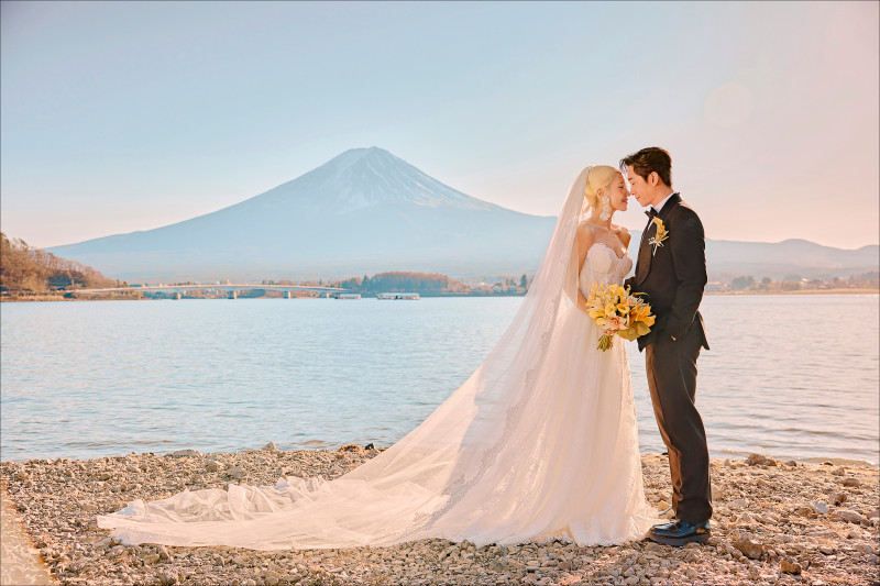 開在日本富士山河口湖拍攝的唯美婚紗照,Lulu穿上以純白深V禮服與陳漢典在富士山的
