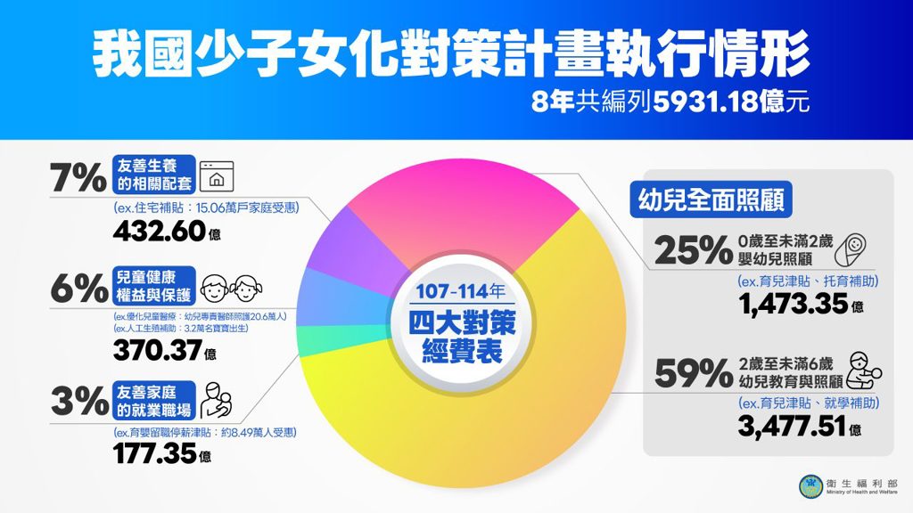 大對策,包括幼兒全面照顧4,950.86億;友善家庭的就業職場177.35億;兒童健康