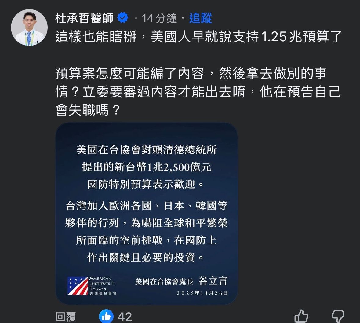 [問卦] 杜承澤醫師:美國人早就支持1.25兆軍購