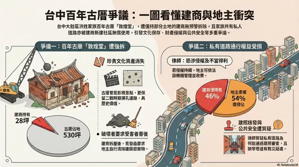 大肚區瑞井路85巷爆發建設糾紛,該處佔地約530坪的洪姓家族百年古厝「敦煌堂」,3.5