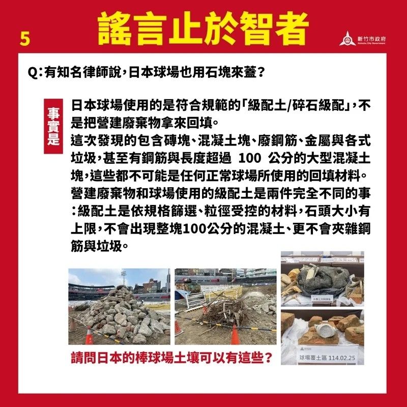工務處強調,有心人士將營建廢棄物回填錯誤比擬為日本球場級配工法,刻意混淆概念。