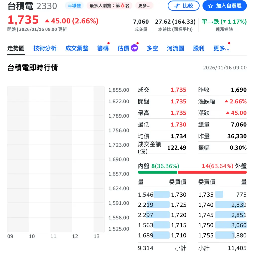 台股今天開盤,台積電直接跳漲到1735