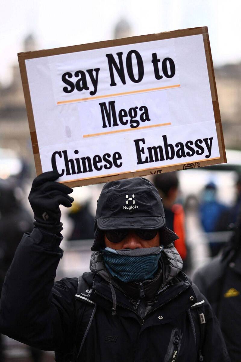 去年2月反中國在倫敦興建「超級大使館」的民眾,在使館預定地皇家鑄幣廠舊址前示威抗議。(法新社檔案照)
