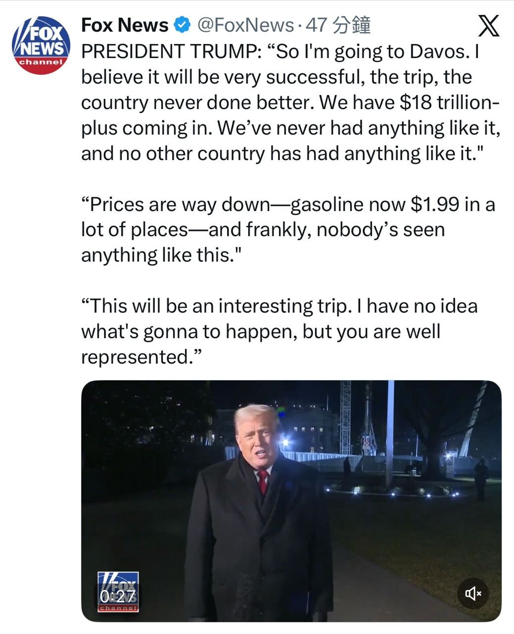 我要去達沃斯惹!美國將迎來18兆美元的收入!我們從來沒有這麼繁榮過!別的國家也從