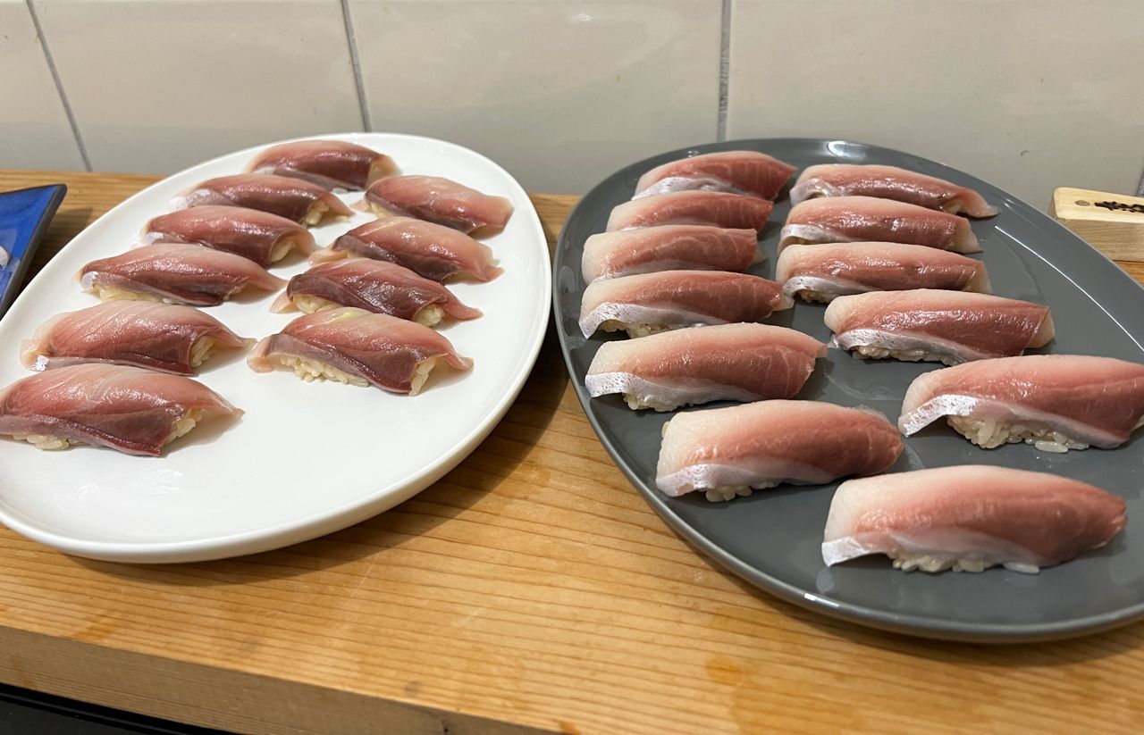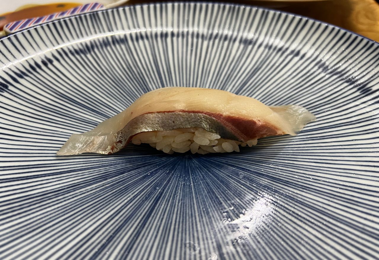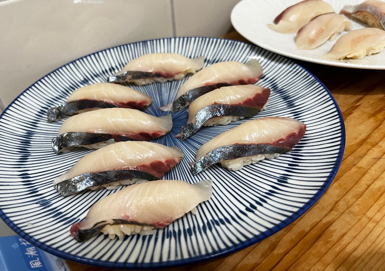 稱號的冰鮮白甘魚(縞鰺)熟成一週做壽司。白肉魚的話全用紅醋會太搶味道所以又買了