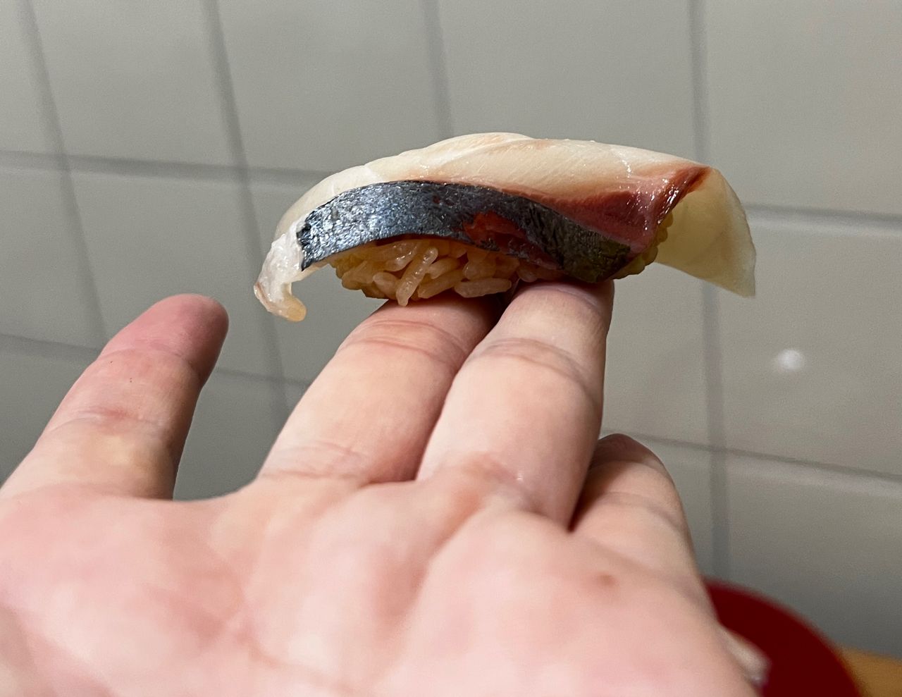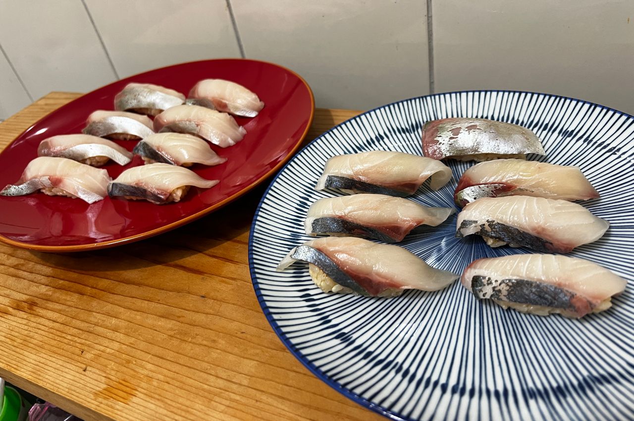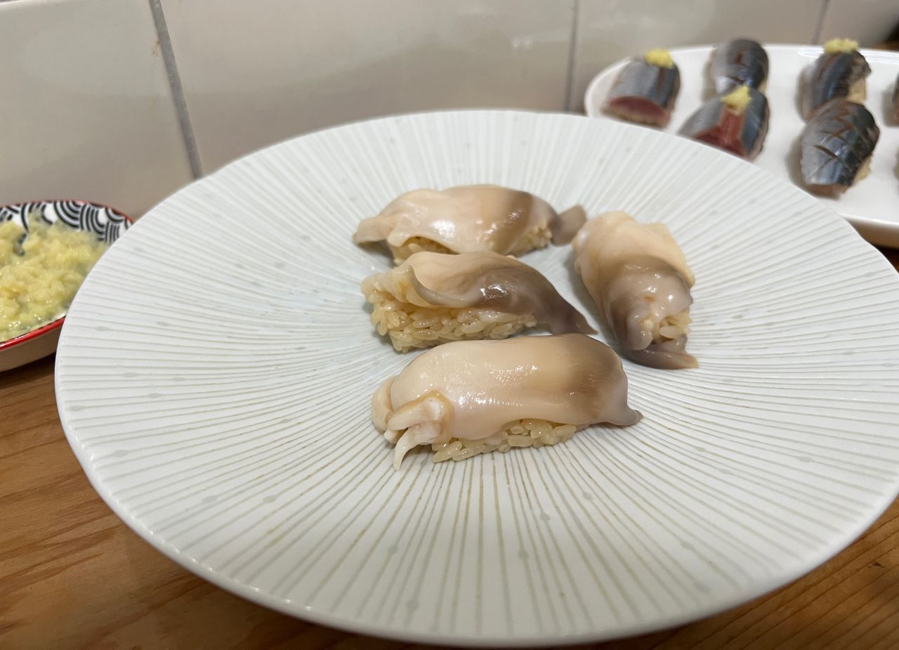 稱號的冰鮮白甘魚(縞鰺)熟成一週做壽司。白肉魚的話全用紅醋會太搶味道所以又買了