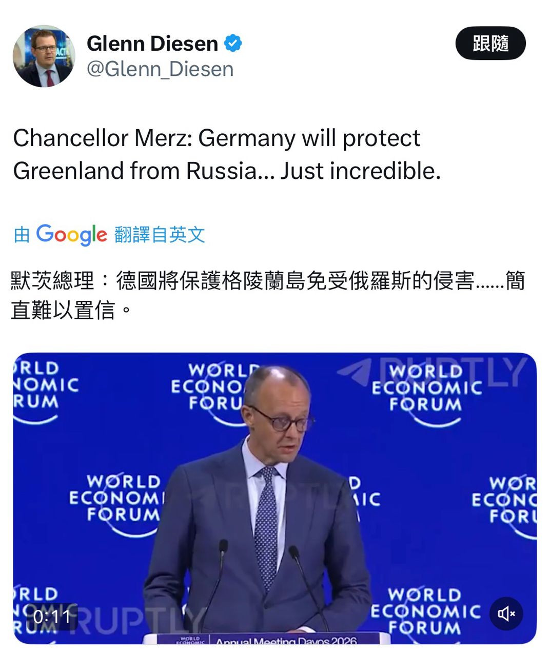 德國首相Merz在達沃斯經濟論壇上發表談話表示: