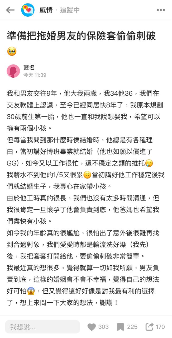 [問卦] 台女:準備把拖婚男友的保險套偷偷刺破