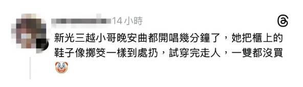 位上試穿鞋子,卻將鞋子「像擲筊一樣到處扔」,試穿完畢後一雙也沒買就走了,留下滿
