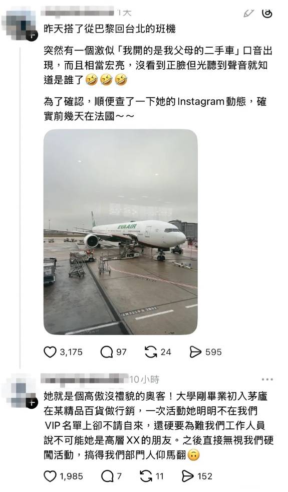 網友分享在班機上巧遇Melody的經歷,意外掀出她是「服務業殺手」的討論。(翻攝自