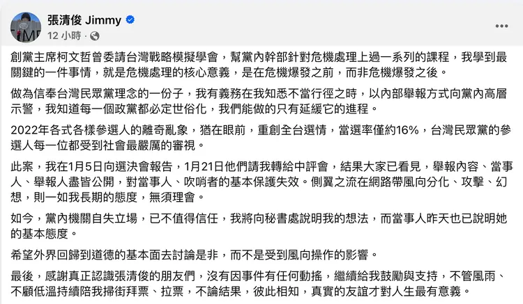 張清俊指出,做為信奉台灣民眾黨理念的一份子,他有義務在我知悉不當行徑之時,以內
