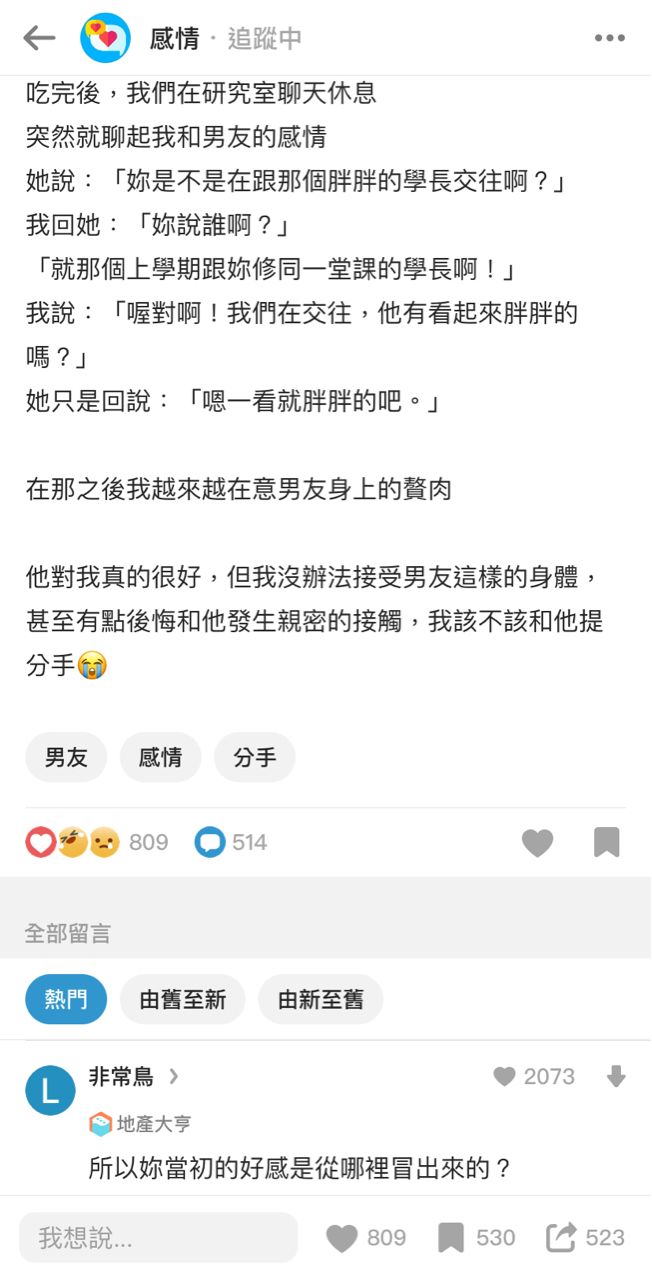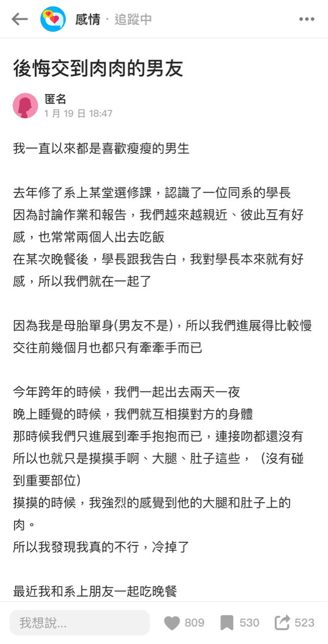 [問卦] 台女:後悔交到肉肉的男友 - Gossiping 板