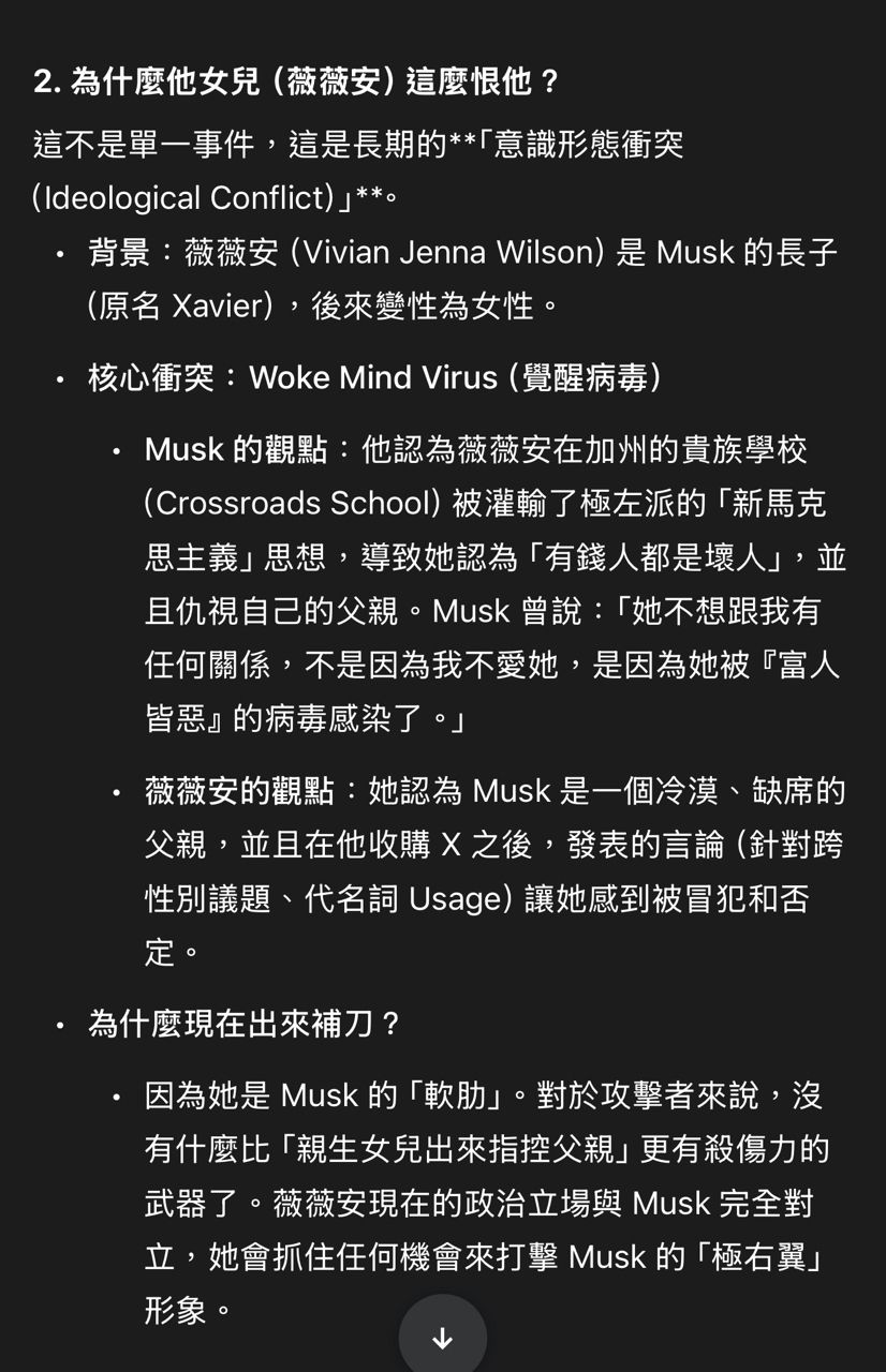 → eagleofsouth: 這個女兒跟Musk不對盤 聽聽就好6F 219.85.133.119 台灣 02/03 22:22