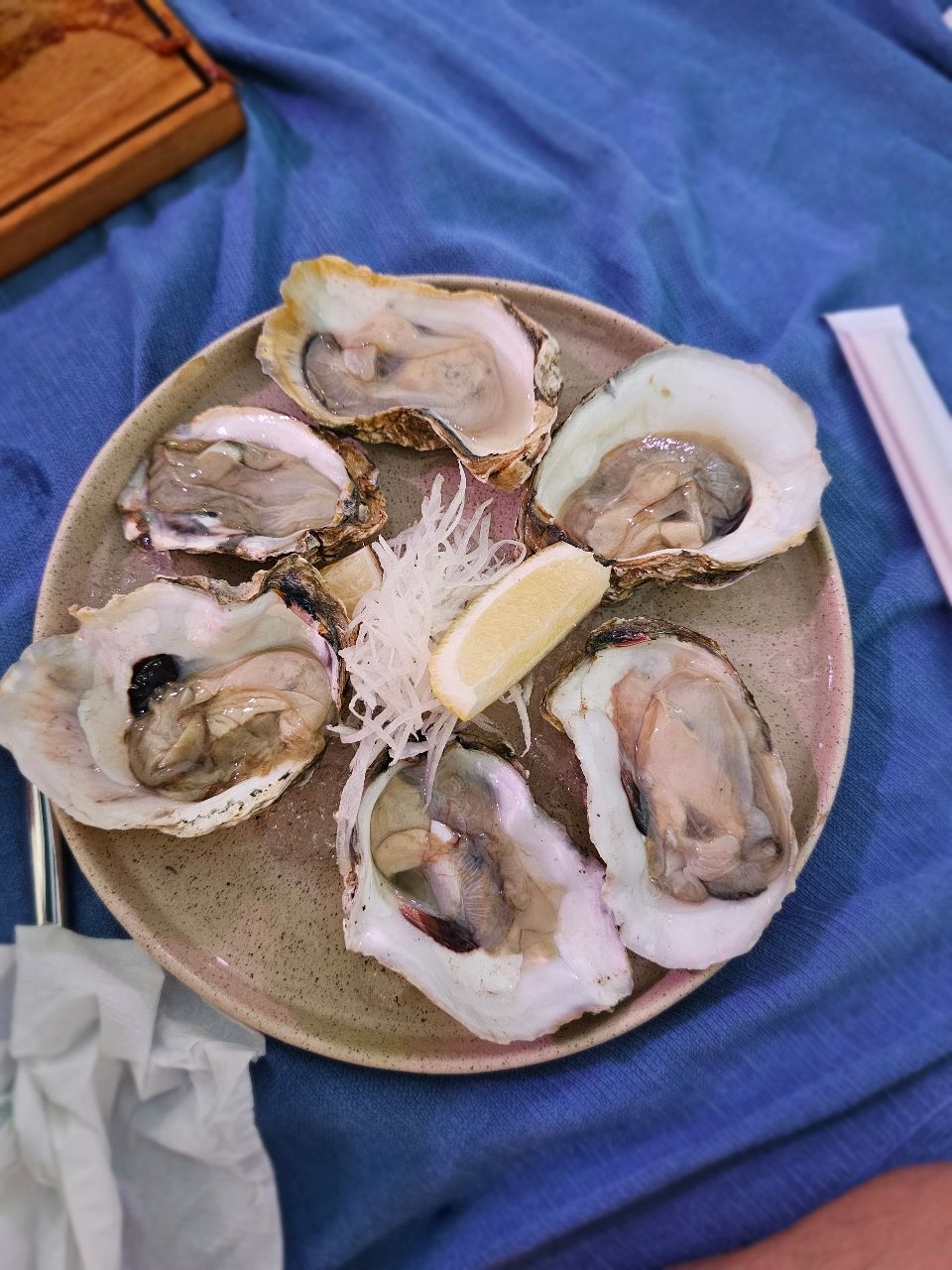 一堆牡蠣、淡菜、炸蝦、炸魚、生菜