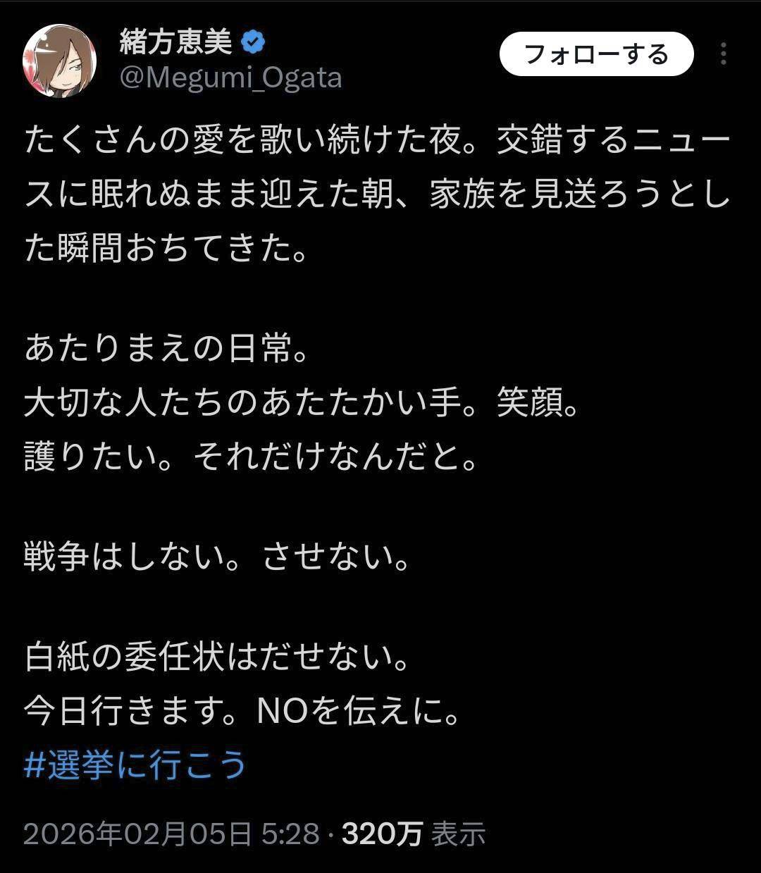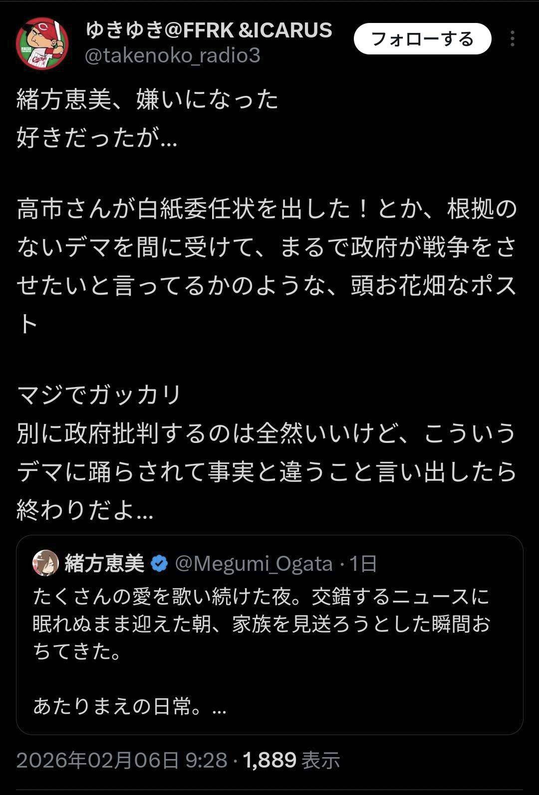 因為高市現在支持度很高 不少人說開始討厭緒方惠美了
