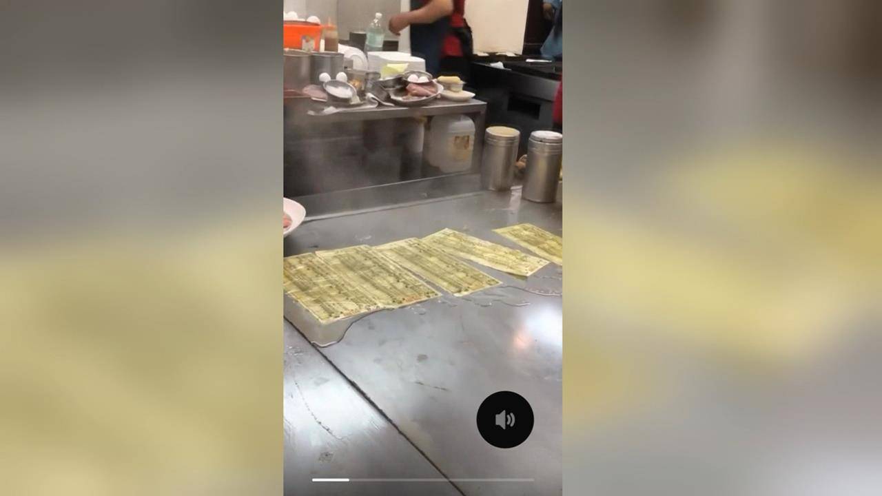 黃色菜單一字排開,就放在煎台上,上頭似乎還沾滿了水,瞬間加熱,把菜單煎到「滋滋作響」,不停跳動,店員疑似因為趕單,方便確認餐點,直接把菜單放在煎台上,客人菜單直接躺平,成了煎台料理的一部份。民眾表示「那個紙張上可能會有一些,細菌或病毒又有一些油墨,如果他這樣子炒盤上,可能會沾染這些東西,再炒食物感覺不是很衛生。」民眾表示「我覺得比較不妥觀感不好,因為人家吃的要做吃的煎台,放(菜單)那種東西,好像比較不好。」