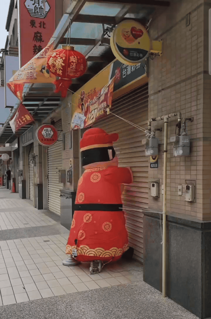 神爺」氣球卻面向店家,前後不斷擺動,讓網友笑翻直呼「財神爺已經在敲門了」,掀起