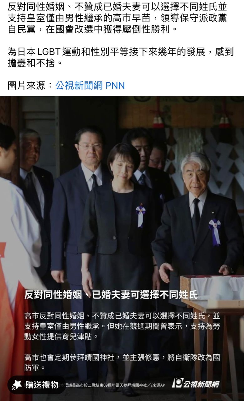覺青:高市什麼都好,就只差在女權跟LGBTQ輸台灣。有卦否?