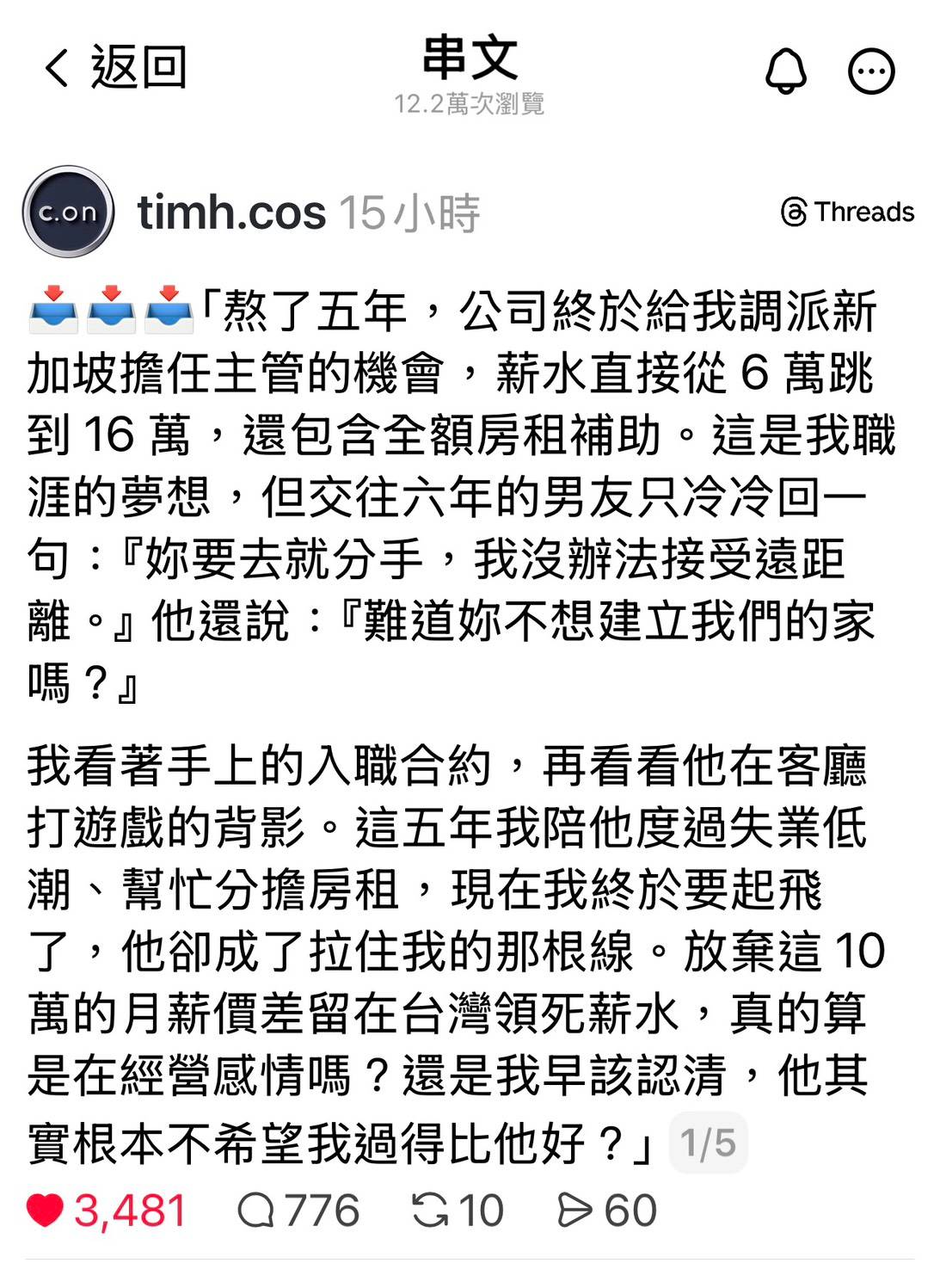 撂下狠話:「妳要去就分手 我沒辦法接受遠距離!」