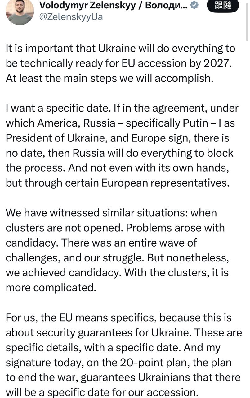 烏克蘭大統領弗拉基米爾。澤倫斯基稍早發了一篇X說: