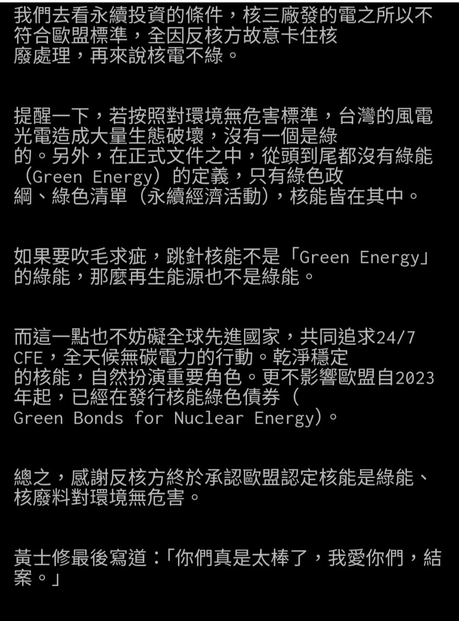 去處、國人有高度共識」原則下進行審慎評估,共同面對傳統核能是否能帶給產業界更大