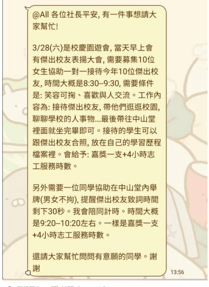 : ▲學務處11日下午在學生會群組公告徵女志工。(圖/校方提供)