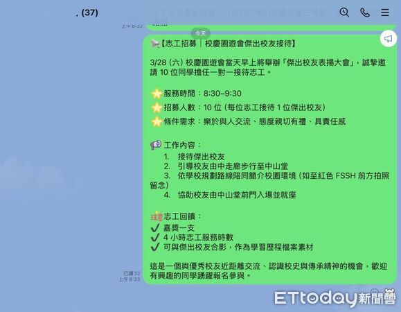 : 鳳山高中學務處11日下午1點,在學生會LINE群組PO文招募校慶志工,對話內