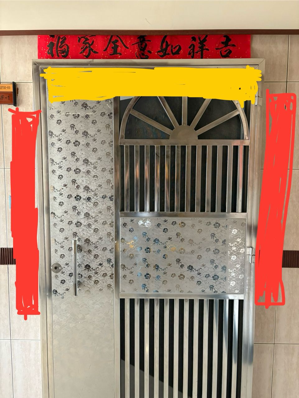 老婆覺得應該貼在鐵門上比較完整不會被擋到。