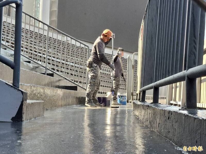 現場工人提到,這幾天進行外野看台區及座位區的防水塗層工程,因是在戶外的空曠地區