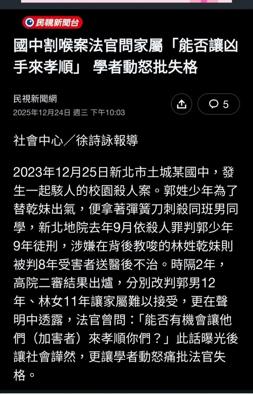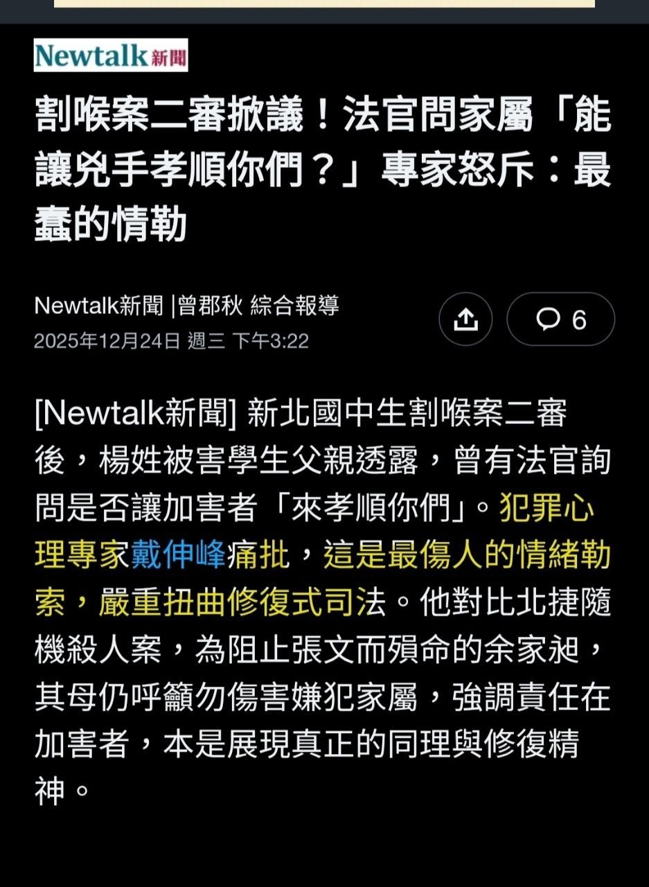 作者 coffee112 (我沒拿$就換你網軍死全家)標題 [新聞]不滿割頸案乾哥妹輕判!楊父、民團預計3ꐱ時間 Mon Feb 16 11:28:50 2026