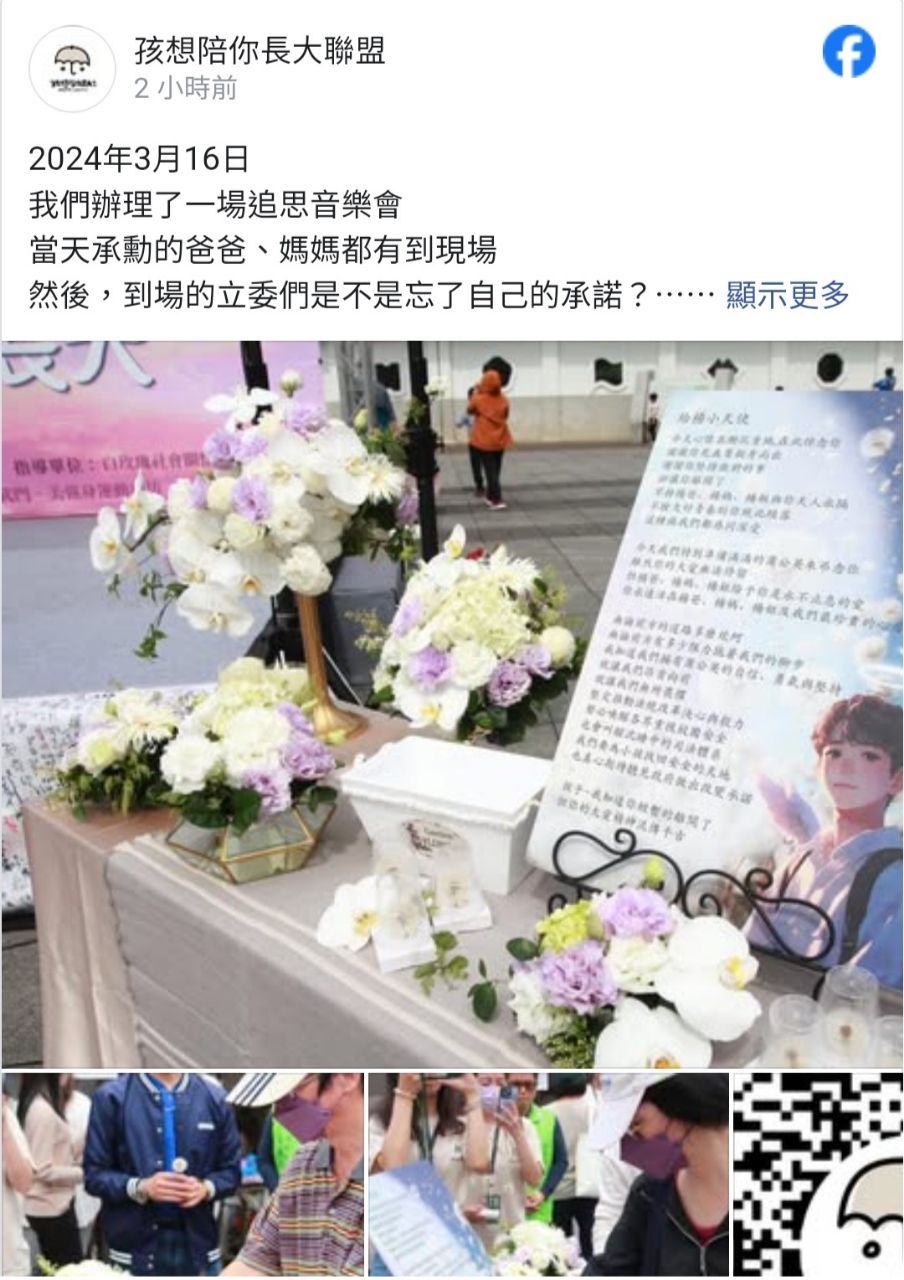 孩想陪你長大聯盟說明,2024年3月16日辦理了一場追思音樂會,當天楊爸爸、楊媽媽都