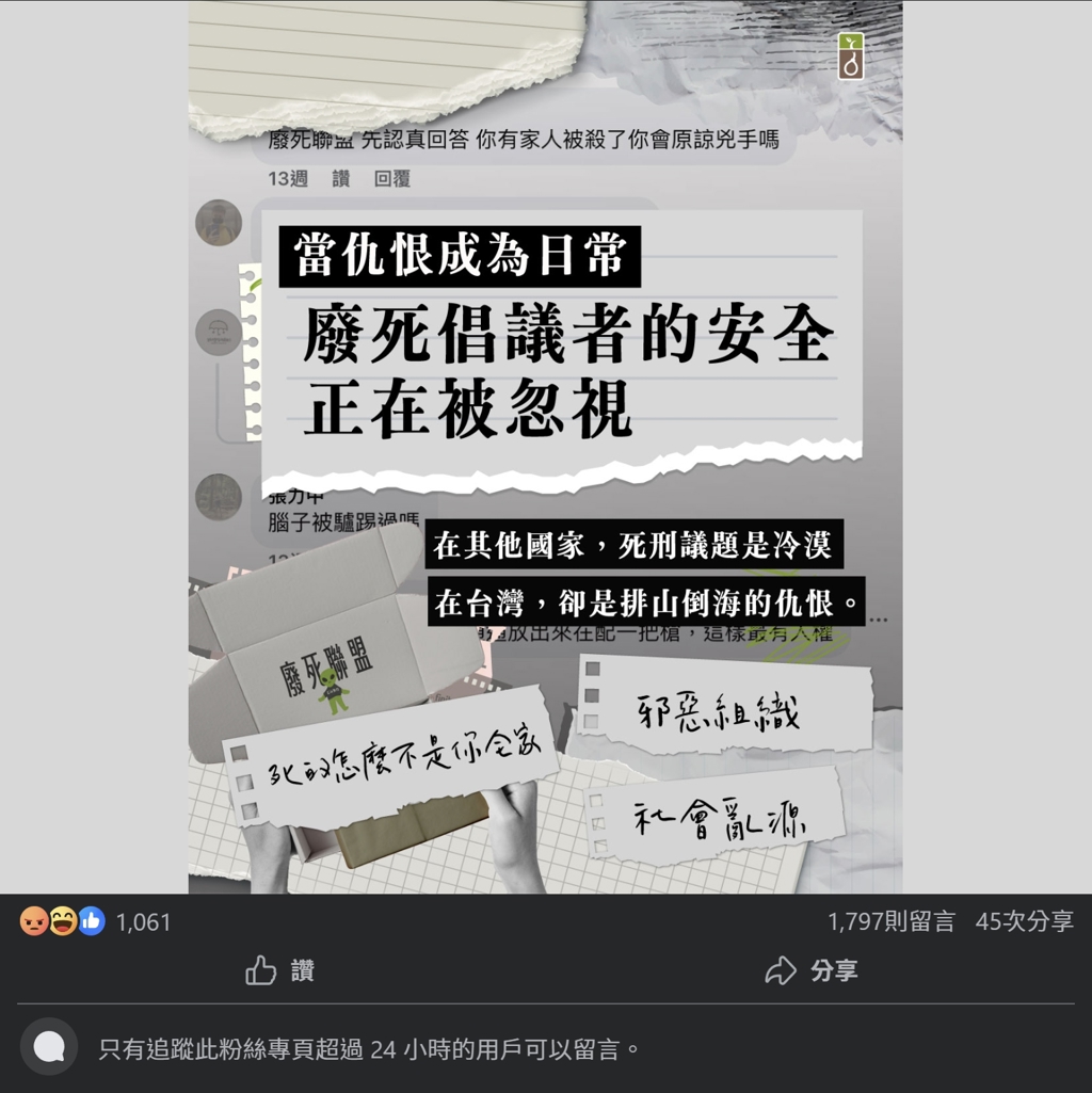 廢死聯盟疑似禁不住憤怒網友聲浪,今(16日)悄悄修改臉書留言權限,