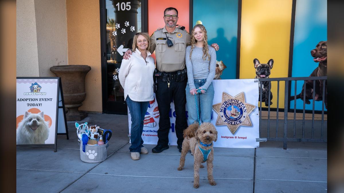 員警布萊克(中)出手、與家人近日正式領養了「捷藍」。(圖/翻攝自Facebook@LVMPD