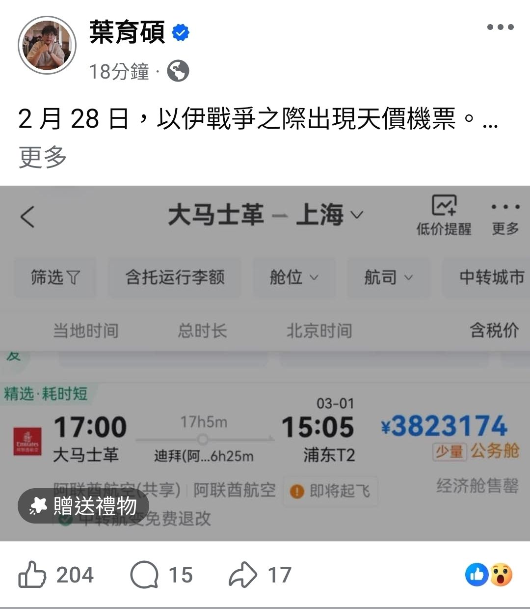 作者 ChengHero (叫我英熊)標題 [問卦] 戰爭前夕剛好全家搭上班機有多幸運?時間 Sat Feb 28 20:33:20 2026