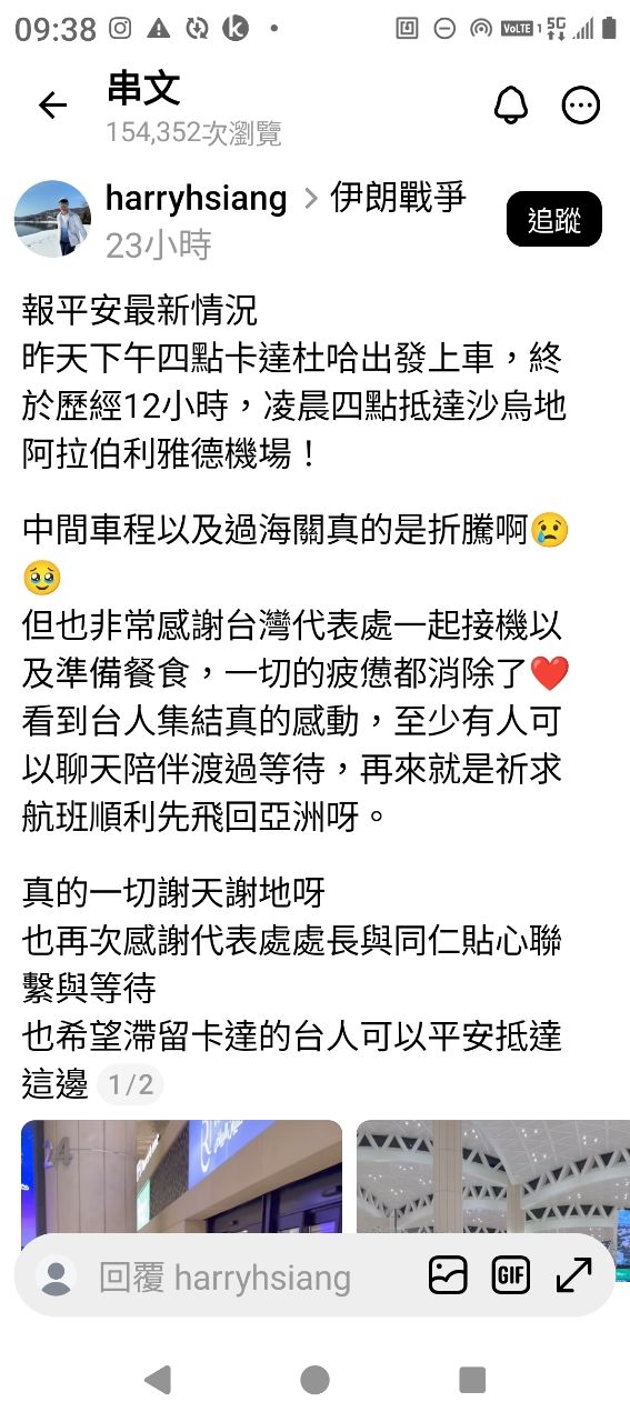 昨天有台灣人從卡達逃到沙烏地阿拉伯利雅德機場說有台灣代表處的人去接,也有拍到影
