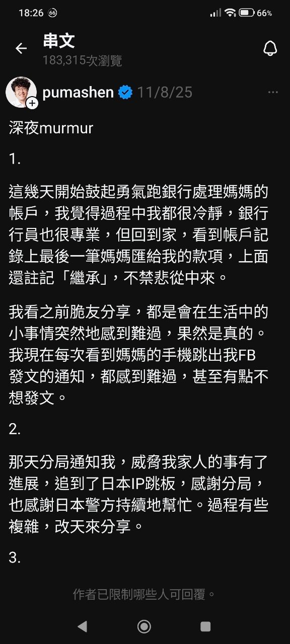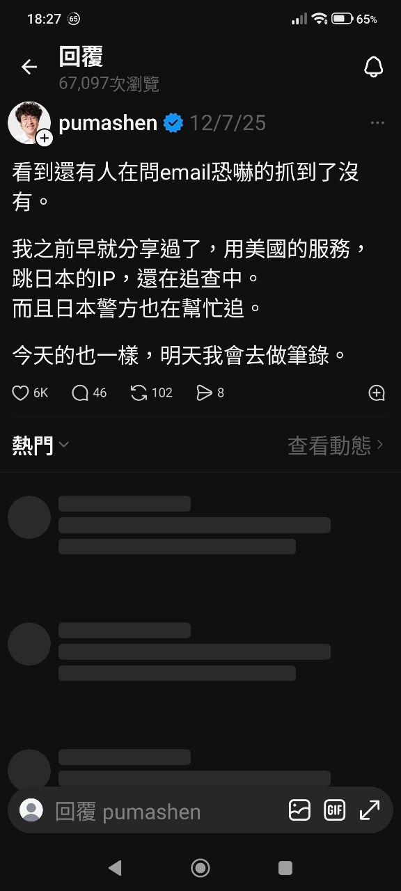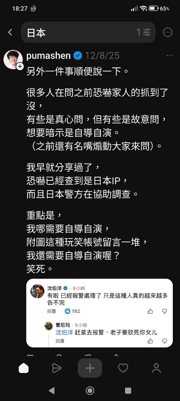 沈柏洋自己就有在threads公布報警之後的進度啊,他說警察查到發文恐嚇的ip在日本,