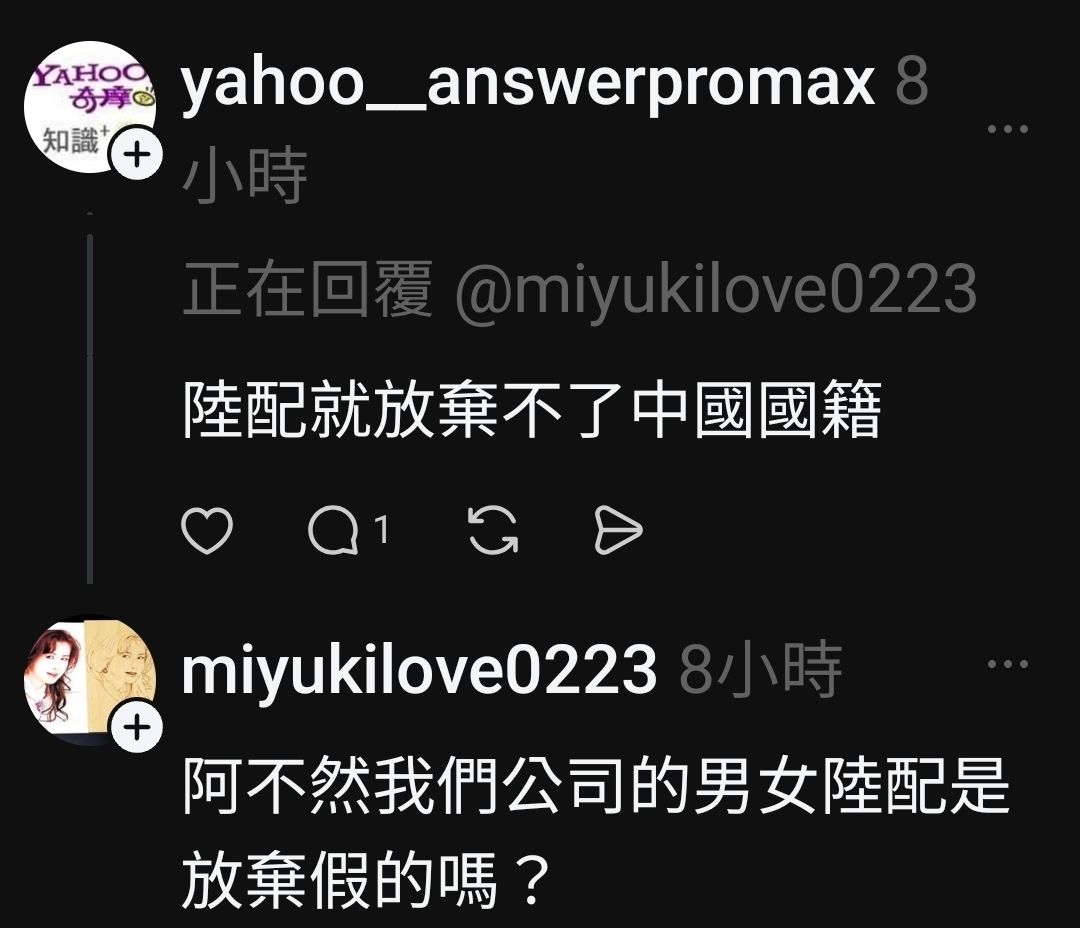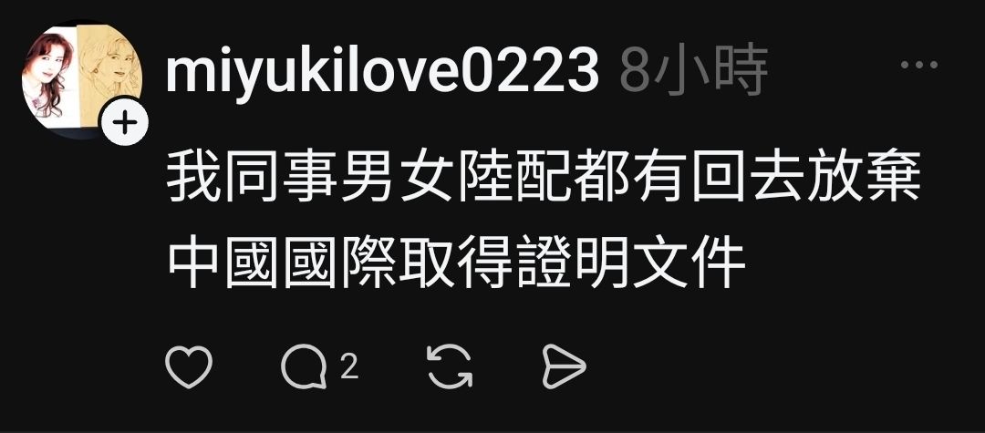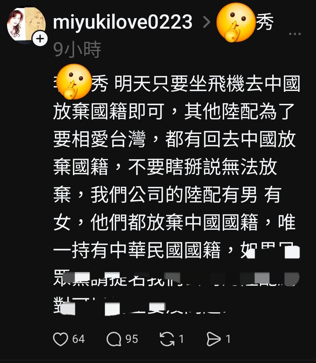 作者 pigpigcom123 (jkk01)標題 [問卦] 脆:我們公司的陸配都有放棄中國國籍!時間 Fri Mar 20 00:36:10 2026