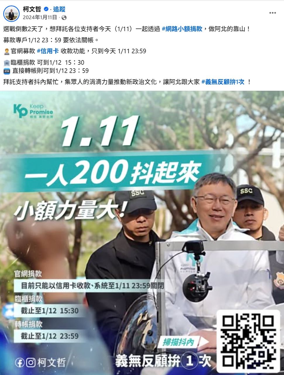 而是柯文哲在選前最後兩天(2024/1/11),發了一篇文叫小草一人捐200元,