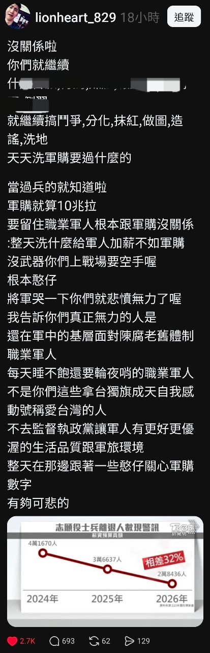 作者 pigpigcom123 (jkk01)標題 [問卦] 脆:軍購加到十兆都留不住人~可悲!時間 Mon Mar 30 02:58:09 2026