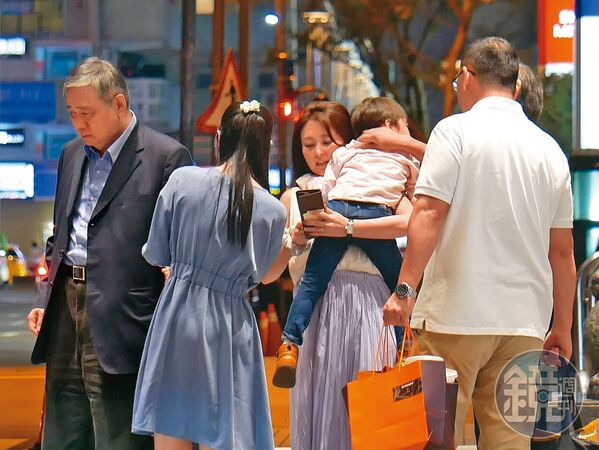 ▲王文洋(左一)與麻衣(左三)、孫子及家人聚餐後,步出百貨公司。