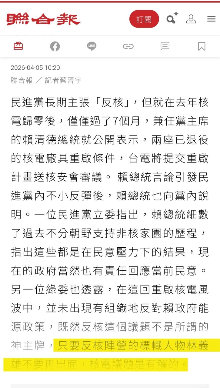作者 coffee112 (我沒拿$就換你網軍死全家)標題 [新聞]坦言年輕人不排斥核電 綠營人士:如何跟「時間 Mon Apr 6 09:43:28 2026