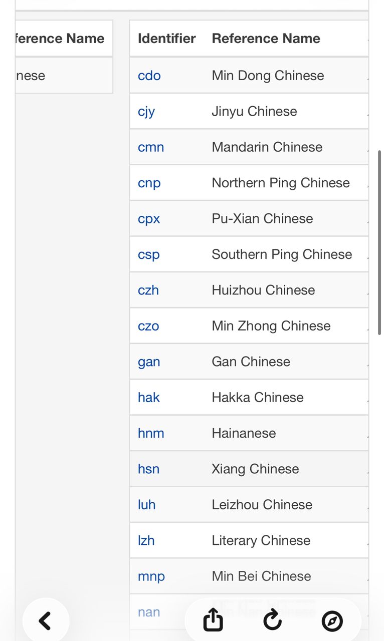 : )、cpx(莆仙)、czo(閩中)、mnp(閩北)、nan(閩南)……