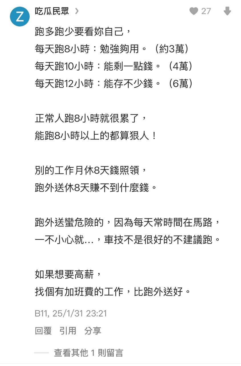 作者 bruce20053 (傑哥哦)標題 [問卦] 外送員是不是快變成台灣第一大產業了時間 Tue Apr 7 15:11:42 2026